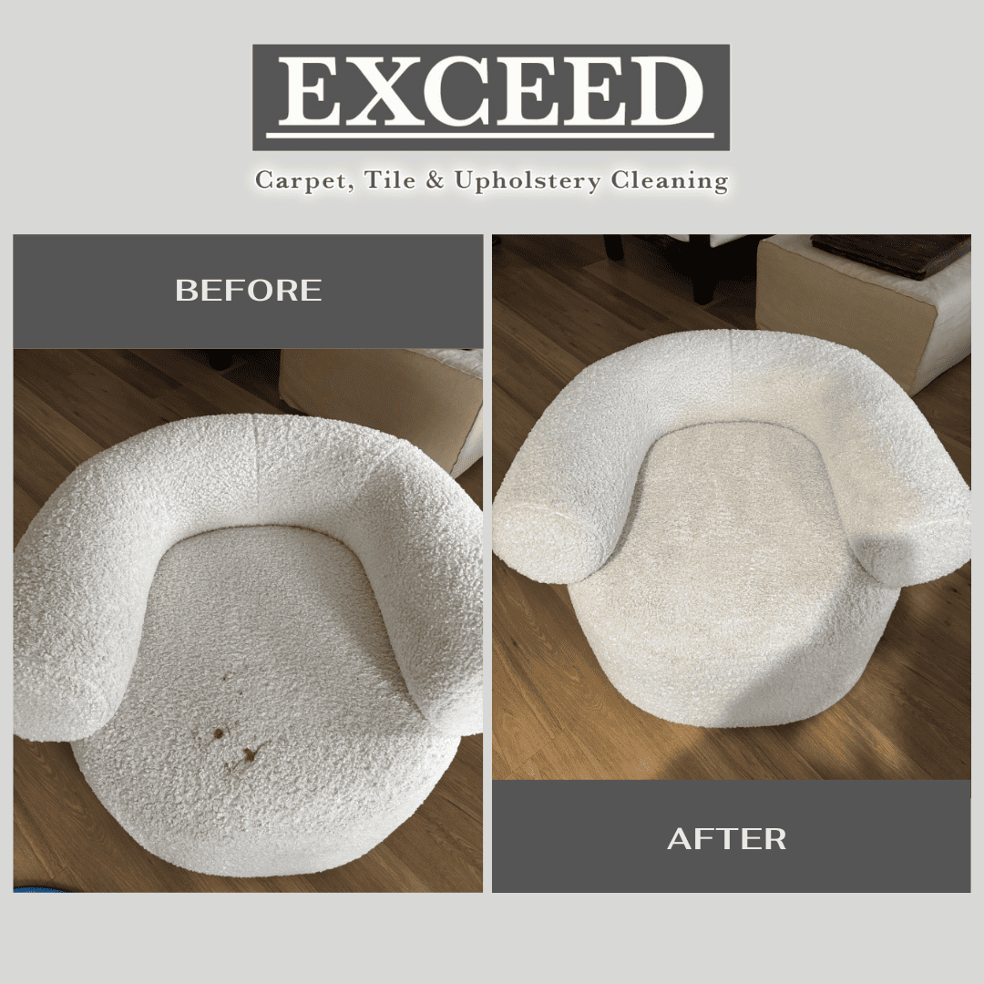 See how Exceed Carpet Cleaning removed tough foundation stains from a white chair in Chapman ACT. Expert upholstery cleaning with amazing results.